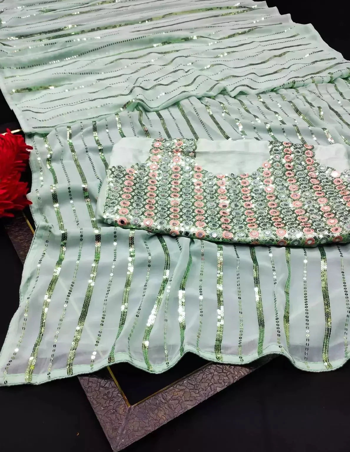 Shine like a star in this stunning pure georgette sequin saree, inspired by celebrity red-carpet elegance. Crafted with precision and luxury in mind, this saree features intricate all-over sequin embellishment that glimmers beautifully under light. The smooth georgette fabric adds effortless flow and movement, giving your drape a graceful, polished look while maintaining all-day comfort.