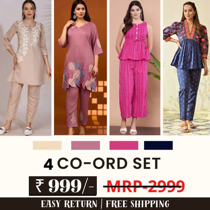 The 4 Co-ord Set Women Combo offers a versatile and stylish wardrobe upgrade for every occasion. This collection includes an elegant ethnic co-ord set, perfect for festive celebrations with its intricate prints and rich fabrics like silk or cotton in vibrant hues such as maroon or emerald green.