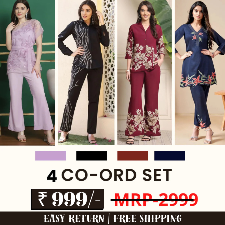 The 4 Co-ord Set Women Combo offers a versatile and stylish wardrobe upgrade for every occasion. This collection includes an elegant ethnic co-ord set, perfect for festive celebrations with its intricate prints and rich fabrics like silk or cotton in vibrant hues such as maroon or emerald green.