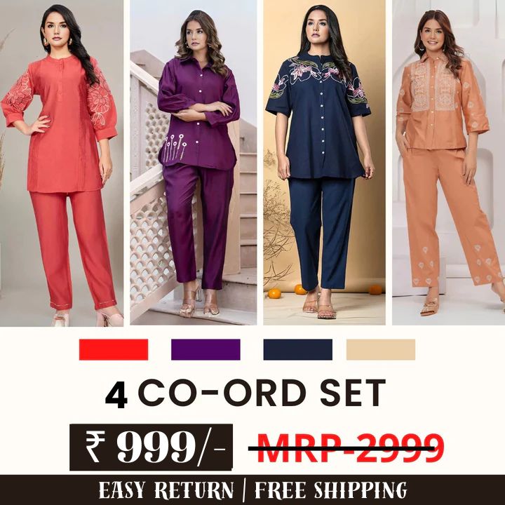 The 4 Co-ord Set Women Combo offers a versatile and stylish wardrobe upgrade for every occasion. This collection includes an elegant ethnic co-ord set, perfect for festive celebrations with its intricate prints and rich fabrics like silk or cotton in vibrant hues such as maroon or emerald green.